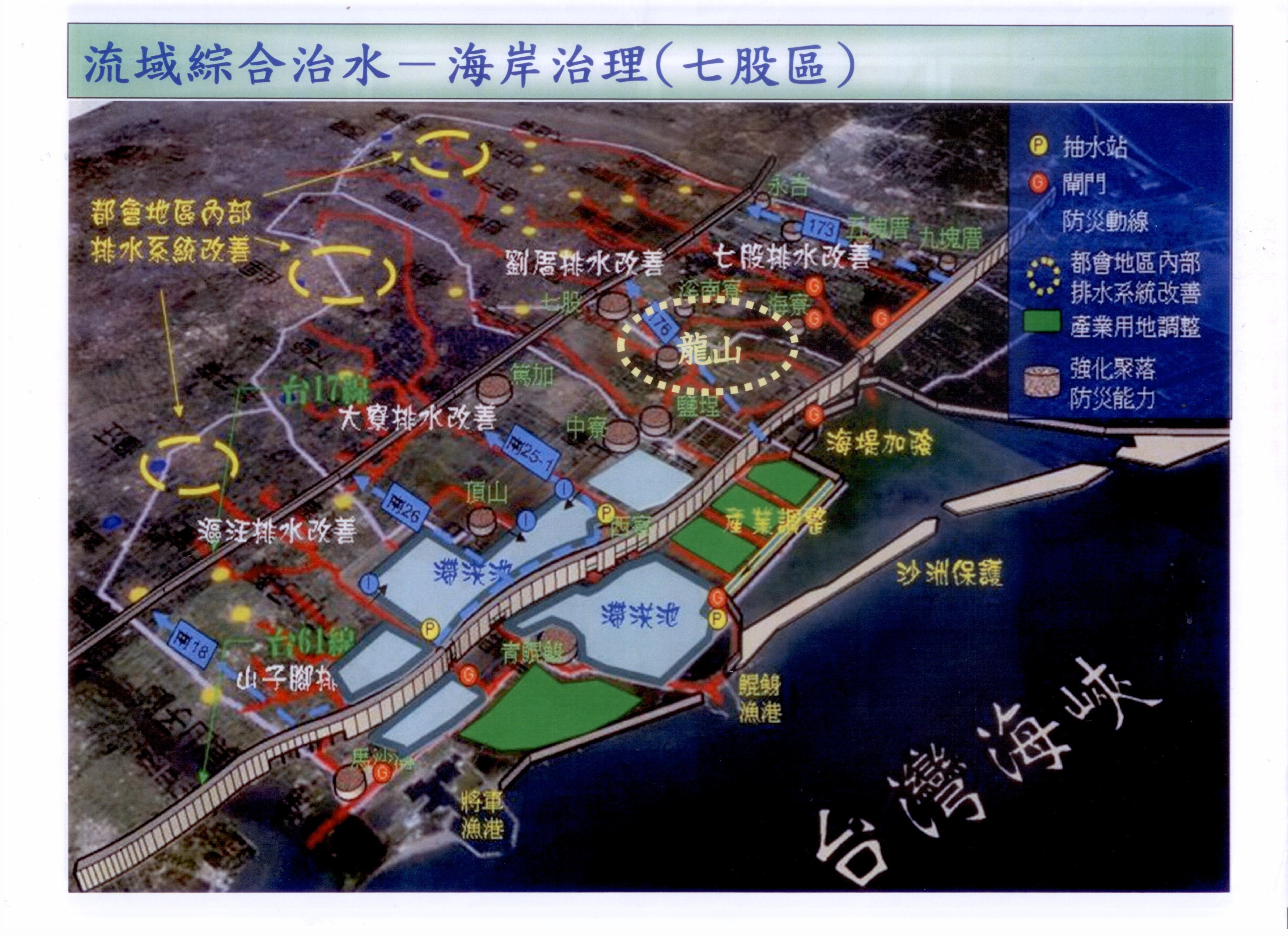 因此現在水利局開始從各方面對症下藥。水利局認為龍山社區防洪有四個要點,第一道防線是外海的沙洲,足夠面積的沙洲可以削減暴潮還有波浪的衝擊,第二道防線是沿岸的海堤,足夠高度的海堤是必要的人造治水設施。如果再隨著氣候變遷,暴潮強度也可能再次增強。所以水利局還預備了第三道防線,就是利用西濱的台61線快速道路側車道,它的高程達到3.5米也可以做為另一種堤岸。若暴潮再朝內陸侵襲,水利局的想法是利用西濱快速道路旁的排水路,諸如劉厝排水,大寮排水,漚汪排水,山仔腳這些排水道一直到西濱快速道路側車道的範圍內,做防潮閘的設施,作為最後的防線,一步一步遏止暴潮。同時有很多內陸的鹽田,台鹽結束製鹽經繳權都以還給國家,若再運用這些鹽田,做一些配套滯洪池,就有一套流體整體的治理方案。