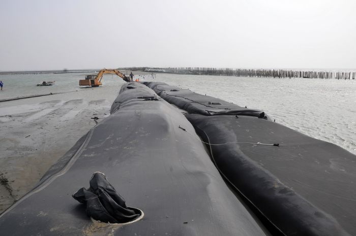 那如果海水不幸倒灌進來陸地該怎麼解決呢?水利局今年鞏固了第二道防線—海堤,將原本的海堤高度加高到兩米二,比去年最嚴重的蘇迪勒颱風所引起的兩米一暴潮高些,希望至少能防治好今年的水患,目前工程逐漸在進行,只剩去年水患嚴重的東泊區及西泊區的一小部分尚未完成。預計將在水患高峰期中秋節前夕全部完工。