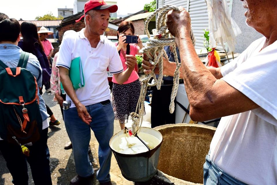 另一口井,坐落在一棟透天厝旁,是供應民生用水的井,紅磚砌成的井欄旁還放著鐵桶,桶上綁著童軍繩顯示了這口井仍在使用中。我們在屋主的指導下嘗試打水,要打上滿滿一桶水比想像地困難多了。屋主說這口井叫娶老婆井,據說只要能打滿滿一桶水上來就能娶老婆,或許是因為只有成年人有那個力氣可以達成這項任務吧!在過去,這口井跟人們的生活緊緊聯繫著,現在雖然已被更加方便的自來水井取代,卻依然參與著人們的生活,在現代的透天厝旁,它是如此地獨樹一格,卻又如此的自然。